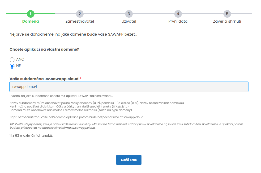 V tomto kroku si zvolíte subdoménu, na které budete k aplikaci SAWAPP přistupovat.