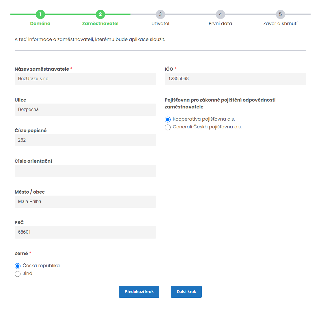 Ve druhém kroku je třeba vyplnit údaje o zaměstnavateli, kterými jsou: