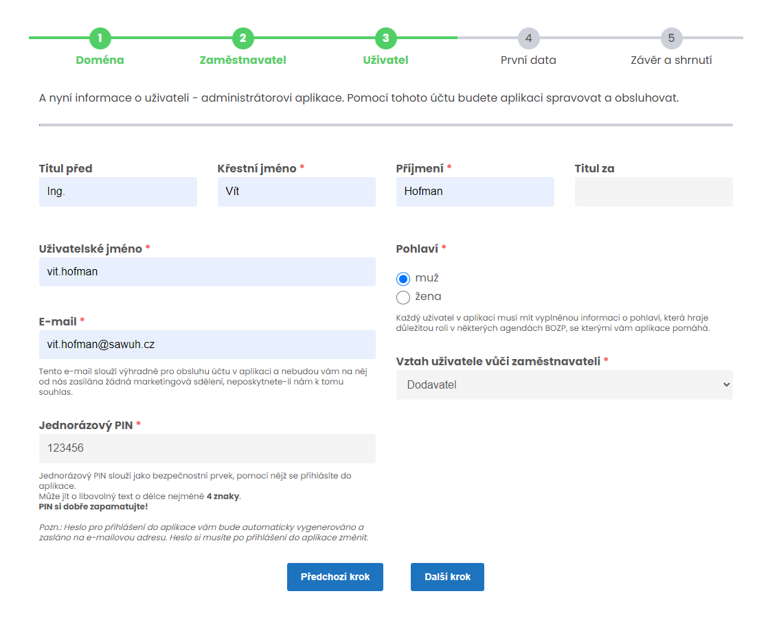 V kroku třetím, vás žádáme o informace o uživateli. Na základě nich v aplikaci SAWAPP vytvoříme první evidovanou osobu a současně uživatele s administrátorskými právy.