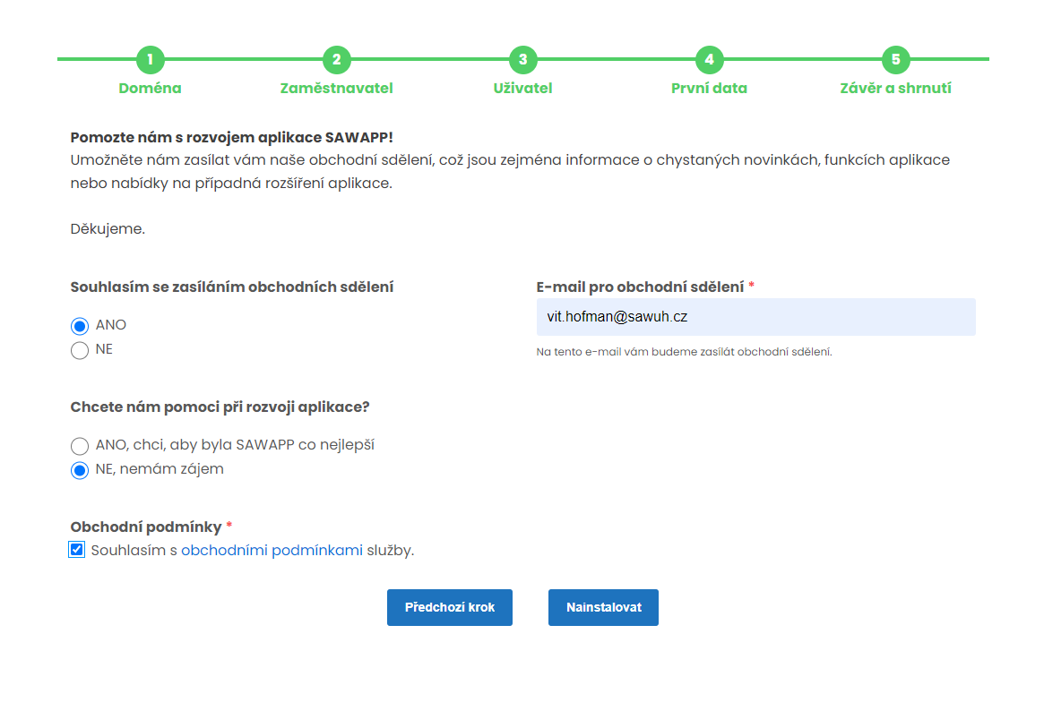 V posledním kroku se vás dotazujeme, zda nám pomůžete s rozvojem SAWAPP, zda chcete přijímat novinky a informace o aplikaci (obchodní sdělení) a v neposlední řadě žádáme o váš souhlas s obchodními podmínkami.